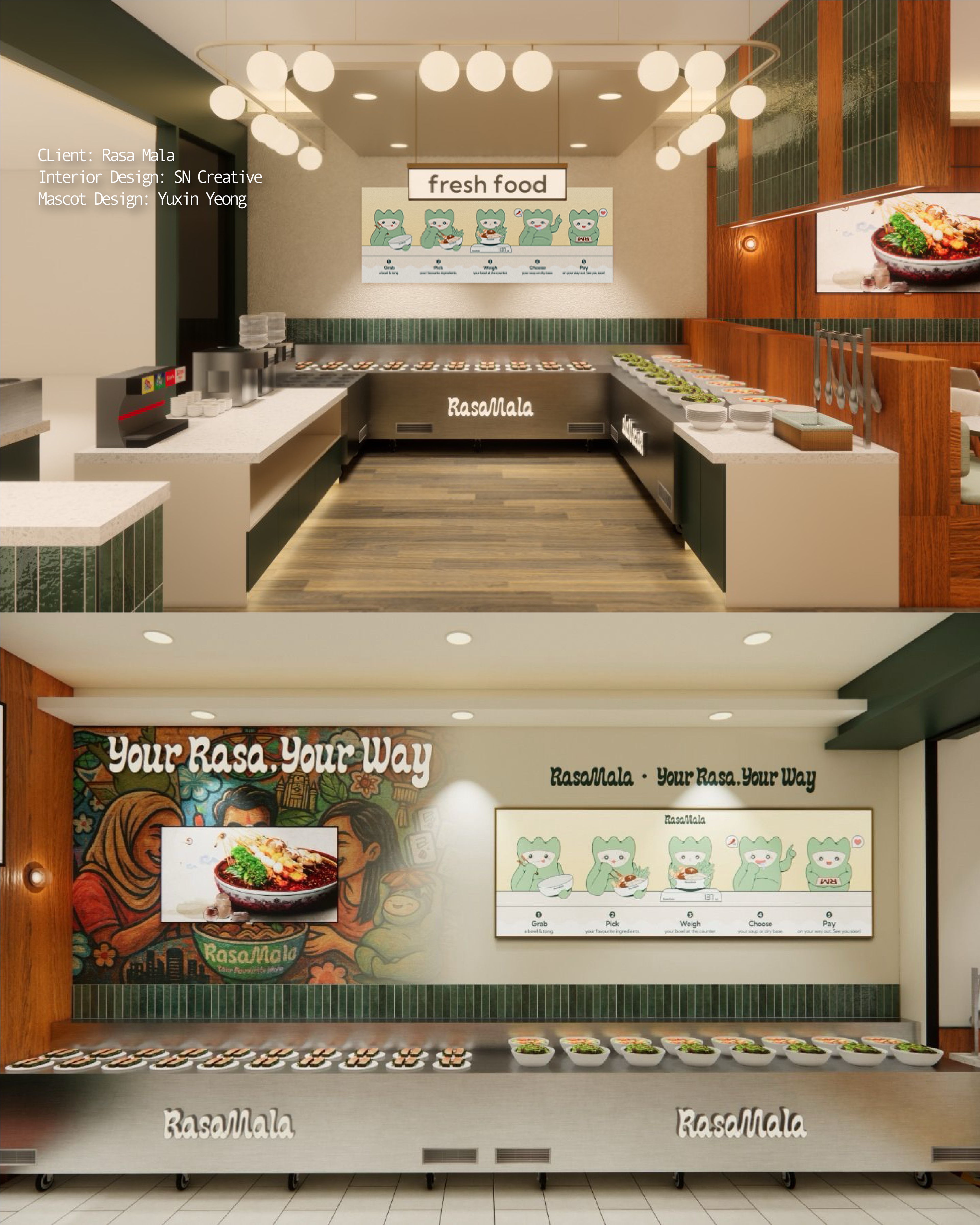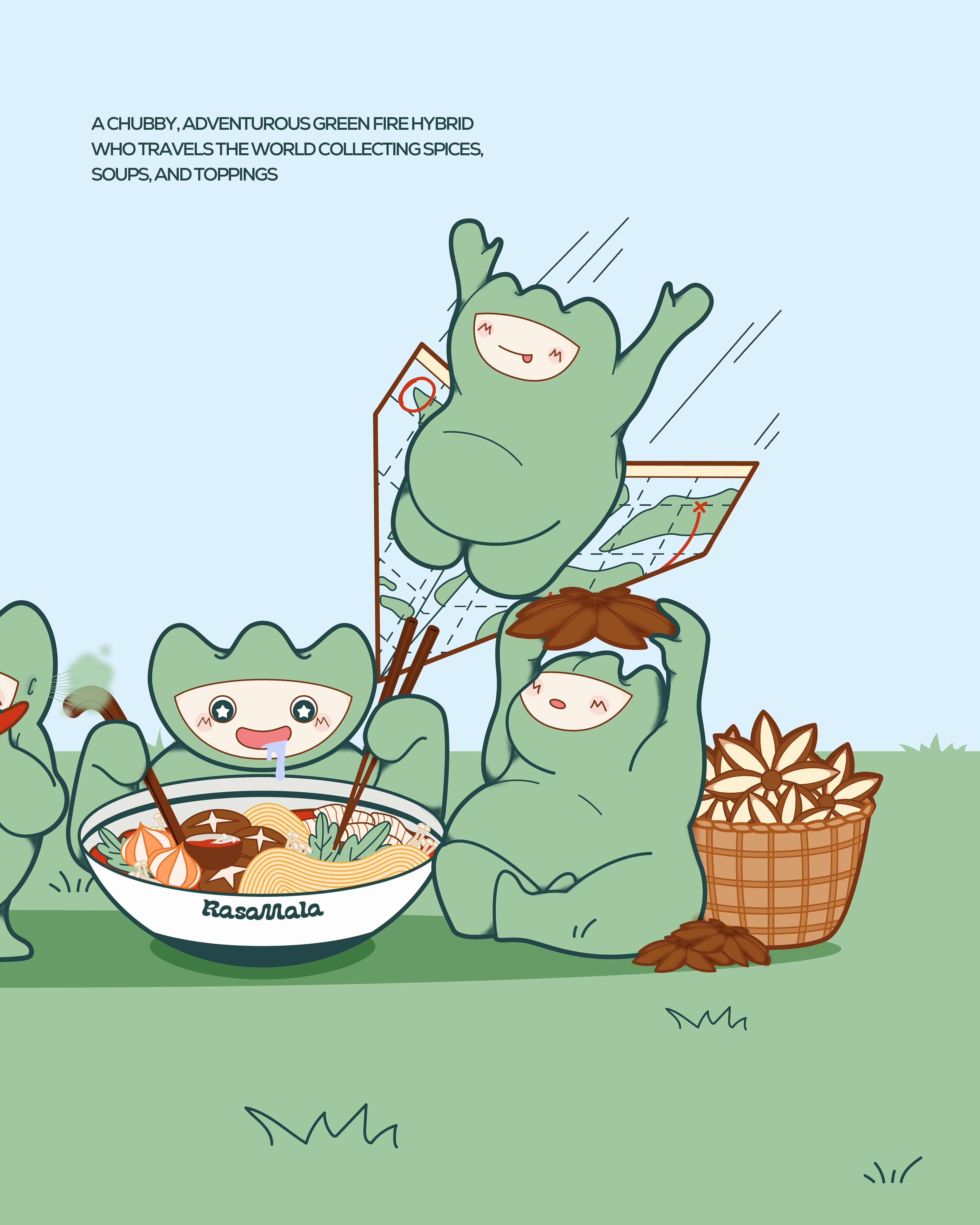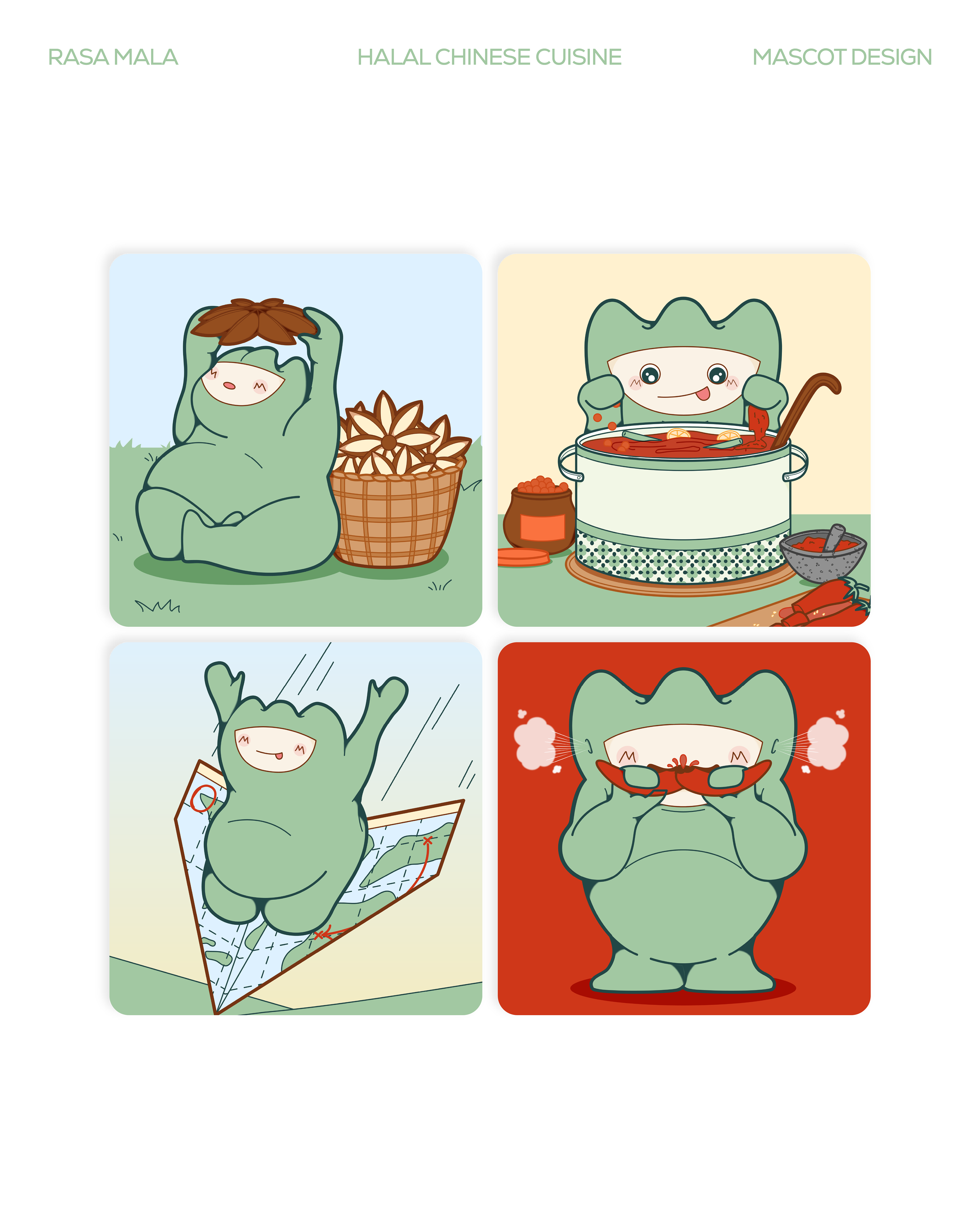 Rasa Mala is a Halal Chinese Cuisine specially designed for Muslim friends. I was part of the team that brings the cute mascot to live. To bring out the Mala look but in a cute image, I was inspired to use fire element and turn it into a cute creature. He is a chubby & adventurous green fire hybrid and his mission is to travel around the world and collect spices!
